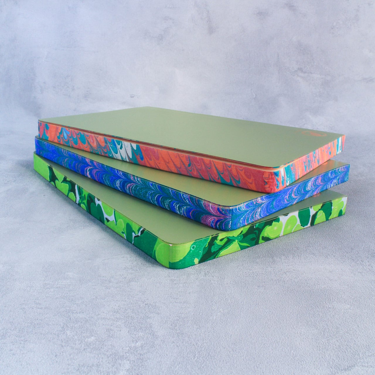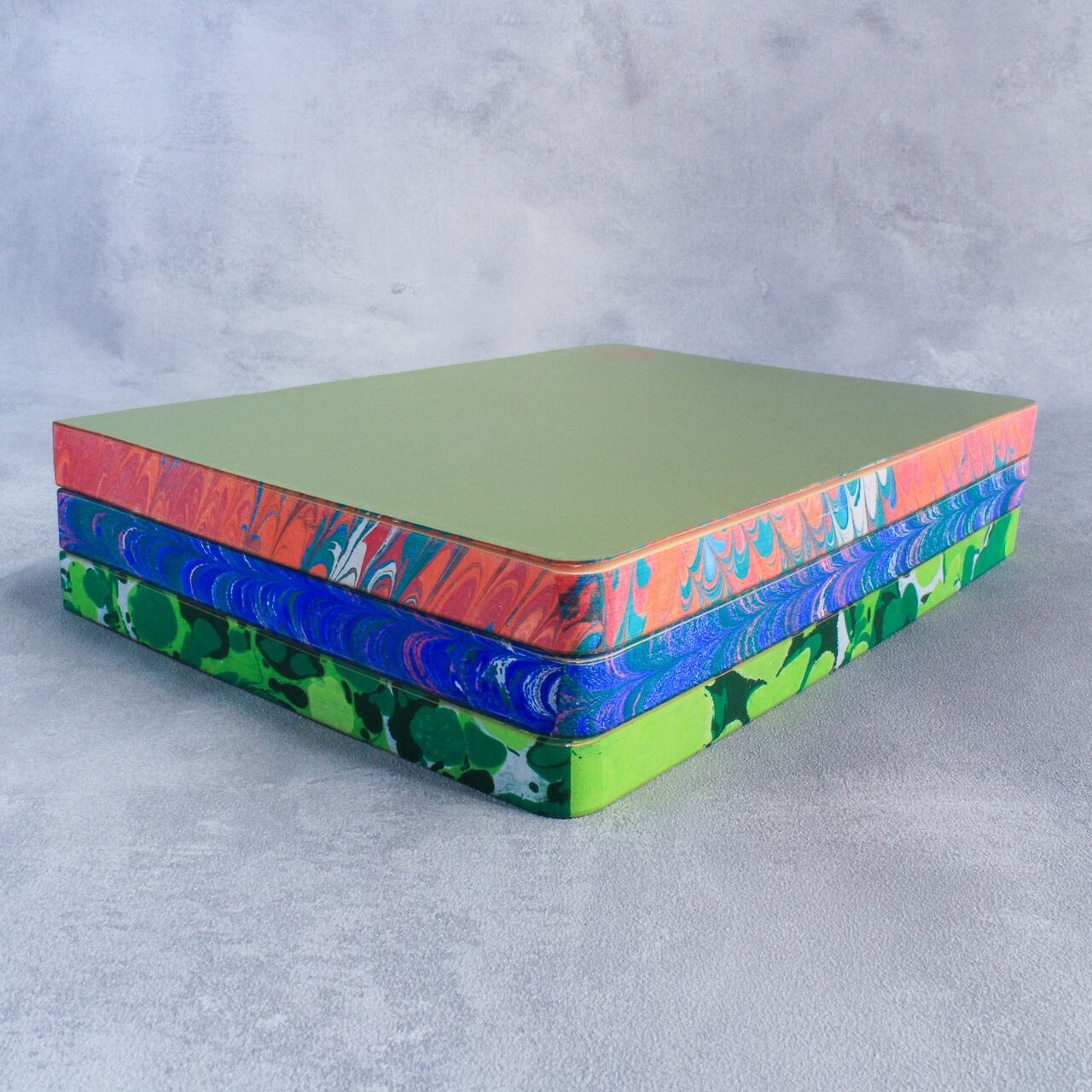 「小口マーブリング」の製造過程で、絵の具や溶剤の回り込み、にじみ、細かな汚れなどが発生する場合があります。品質に問題がないことを確認した上で、良品としてお届けしております。これらの理由による返品・交換は承っておりませんので、予めご了承ください。