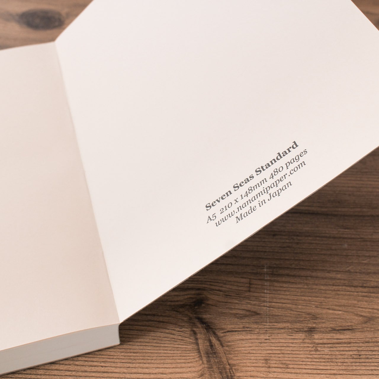 「トモエリバーノートを製作したい。自国ではこの紙を扱う技術が足りず、ぜひ渡邉製本でお願いできないか。」米国カリフォルニアの文具ショップNANAMI PAPERから依頼を受け製作したノート「SEVEN SEAS」。